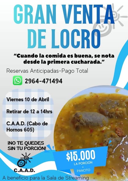 También es posible colaborar mediante transferencias al alias caad.30.2025. Además, se encuentra en marcha la venta de porciones de locro a $15.000, que pueden reservarse enviando un mensaje al número 2974 471494.