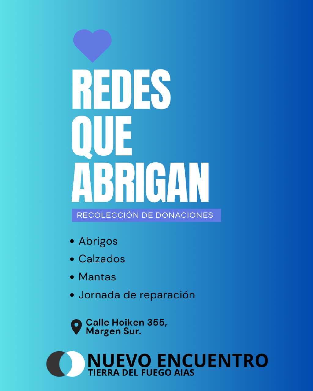 Bajo el lema «Redes que abrigan», la agrupación Nuevo Encuentro Tierra del Fuego AIAS lanzó una campaña solidaria de recolección de donaciones en la ciudad de Río Grande, con el objetivo de brindar contención a las familias que atraviesan el invierno en condiciones vulnerables.